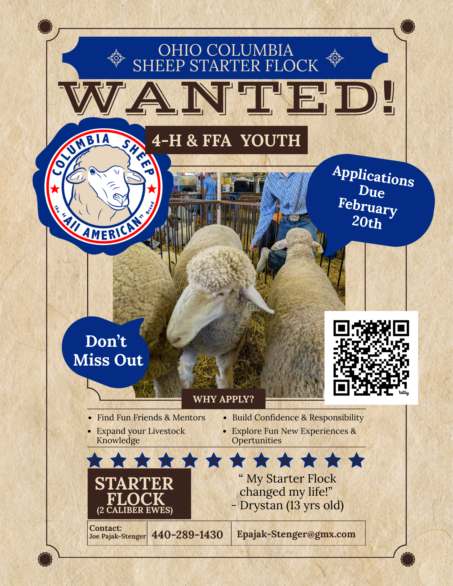 The application deadline is September 30th. For an application and contest rules please contact the Ohio Cheviot Breeders Association Starter Flock Committee Chairperson, Tabitha Weisend, at 740-459-9751 or [email protected].